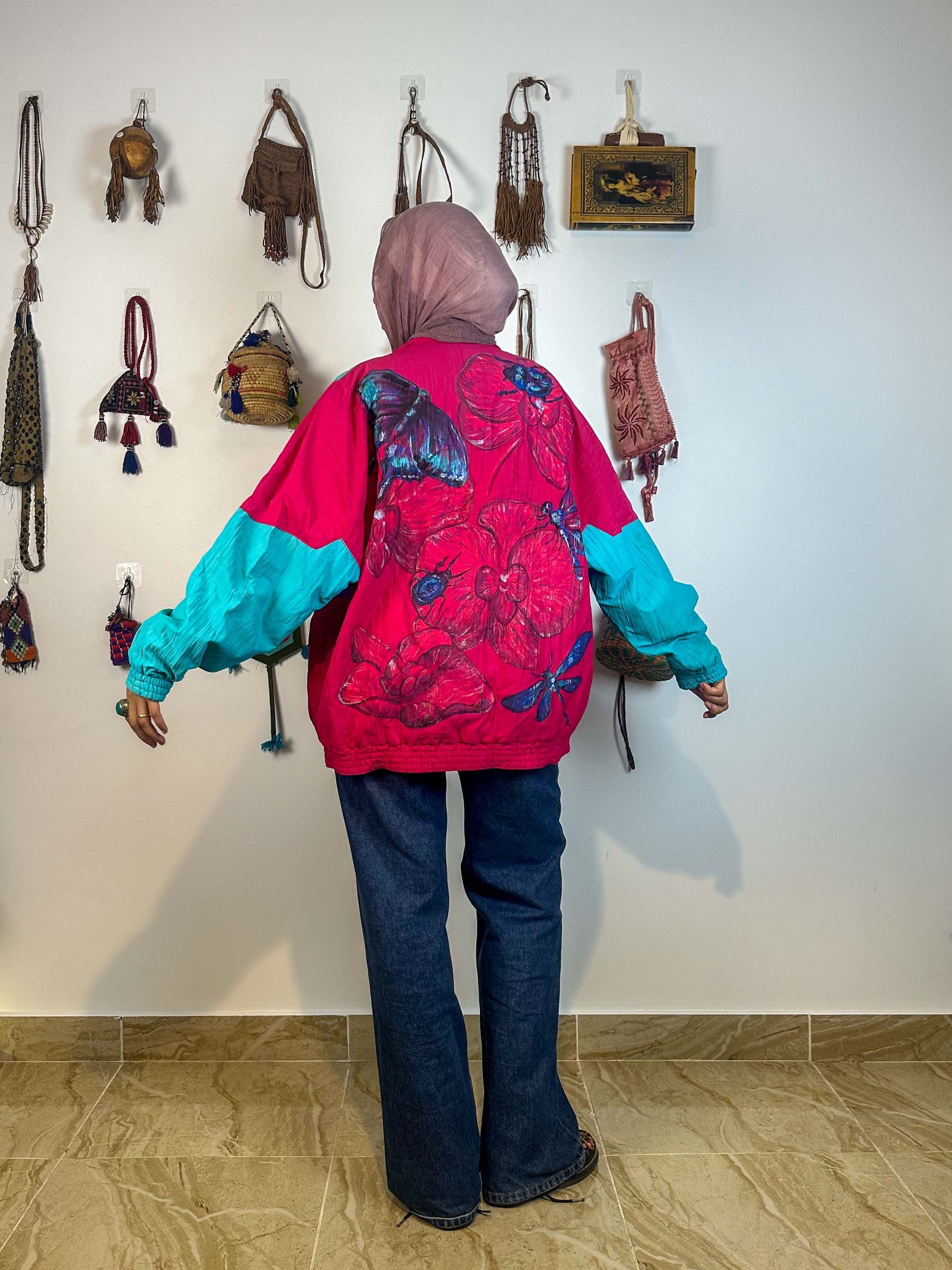 Add a pop of color to your wardrobe with this hand painted wind breaker featuring whimsical butterflies, bugs, and flowers in vibrant turquoise and pink. Stand out in style while staying protected from the elements. A playful statement piece for any fashion lover.